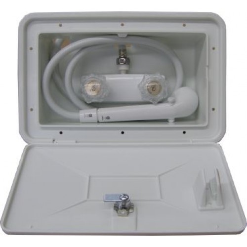 This external shower box is a must for any caravan. They are easy to use, and store. Can be locked away safely whilst driving, and are an extra convenience when traveling the outdoors.